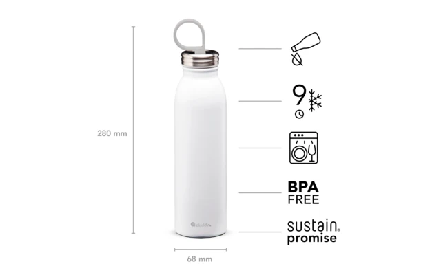 La nuova borraccia Aladdin Chilled Thermavac in acciaio inossidabile è una borraccia portatile ed elegante che garantisce che l’acqua rimanga fresca e ben refrigerata per molte ore e davvero fredda per almeno 9 ore.