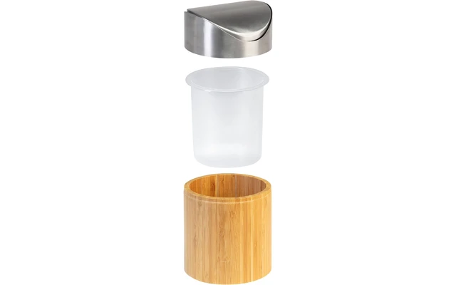 Mini cestino per rifiuti in bambù, attraente ed elegante, con coperchio girevole in acciaio inox e inserto in plastica rimovibile, da utilizzare nel settore della ristorazione o a casa, per uno smaltimento pratico e igienico dei rifiuti da tavola e dei rifiuti domestici.