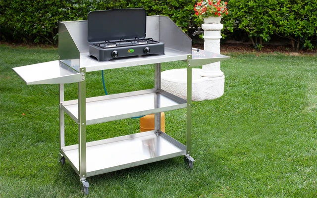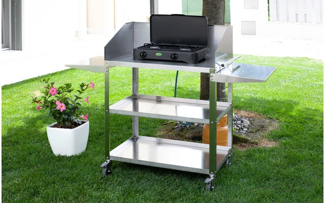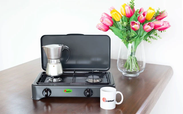 Fornello a 2 fiamme di gas, bruciatore in lega Pyral N2, coperchio del bruciatore smaltato, supporto piatto in acciaio smaltato. Grande design grazie allo speciale colore grigio scuro