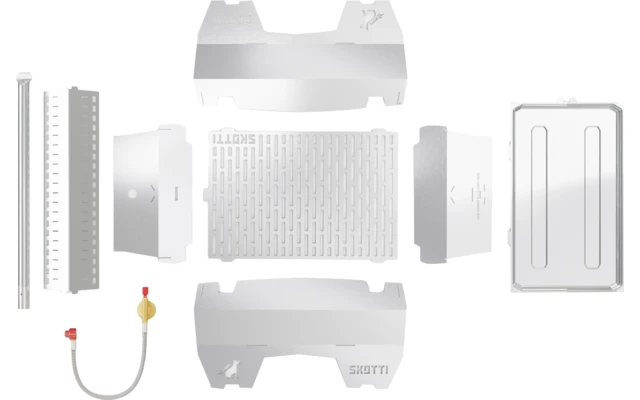 Il grill SKOTTI si adatta senza problemi a qualsiasi camper, zaino da trekking, furgone, canoa, borsa da moto o portapacchi. Oppure potete semplicemente portarlo sotto braccio: SKOTTI, compresa la borsa, pesa solo 3,3 kg. a proposito: il tubo del bruciatore e il tubo del gas sono ben protetti nelle due tasche all’interno della borsa, che ovviamente è inclusa nella fornitura.