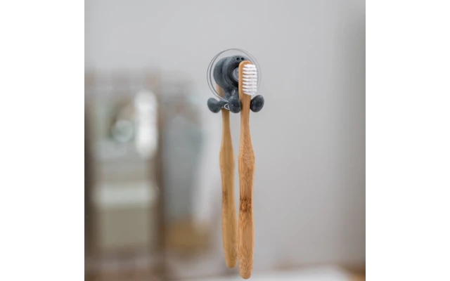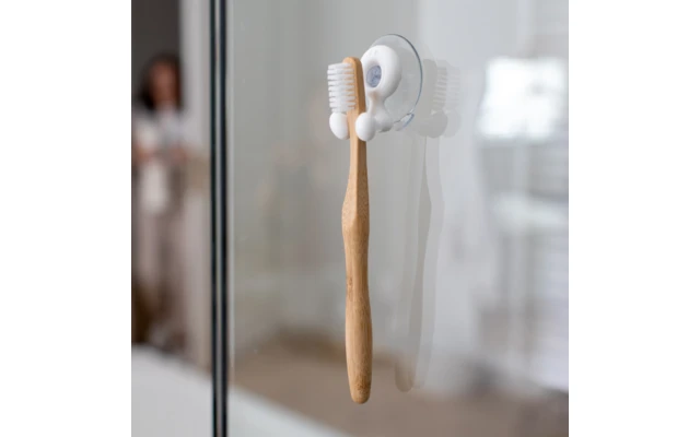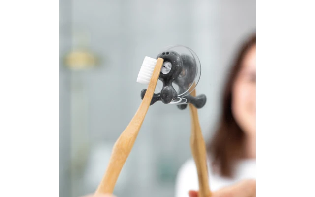 Gli spazzolini da denti possono pendere qui. TOMMY allunga entrambe le gambe e offre una presa d’aria fresca per gli spazzolini da denti. Una soluzione rapida e salvaspazio, soprattutto per i bagni piccoli. Il portaspazzolino si fissa semplicemente alla parete con una ventosa, senza bisogno di installare o forare le piastrelle.