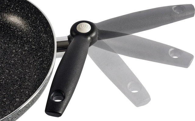 Padella in alluminio in look granito. Interno con rivestimento antiaderente di alta qualità. Particolarmente salvaspazio grazie al manico pieghevole.