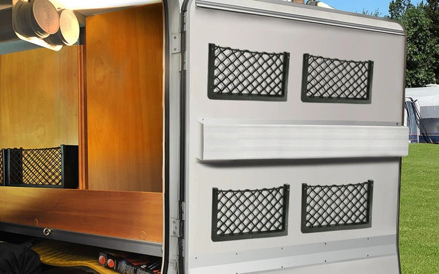 Rete universale per caravan, camper, barca, che fornisce spazio aggiuntivo per libri, bottiglie e molti altri utili accessori da viaggio. I cinque punti di montaggio sul telaio di plastica permettono di montare la rete ovunque. Montaggio a vite.
