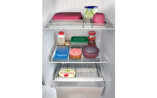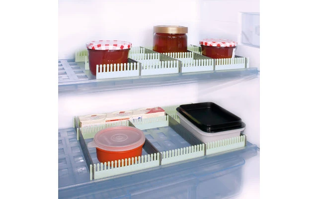 Il sistema ad innesto è composto da 8 vani che formano un inserto a scomparti variabili. I divisori longitudinali e longitudinali in plastica flessibile offrono una protezione ottimale per separare vari articoli e fissano gli oggetti perché non si rompano e non scivolino. Sul lato lungo superiore di uno dei vani sono presenti denti che, semplicemente collegandoli insieme, creano una connessione stabile e solida. La distanza ravvicinata dei denti permette una regolazione flessibile praticamente con qualunque distanza di separazione. Adatto per alimenti di tutti i tipi, contenitori di stoccaggio, barattoli di conservazione,