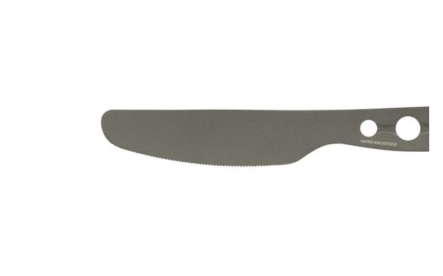 Set di posate leggero e robusto in tre pezzi in alluminio anodizzato duro con fori esagonali incorporati.