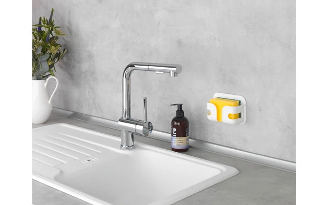 Il supporto decorativo in plastica bianca può essere collocato ovunque e la spugna è quindi sempre a portata di mano