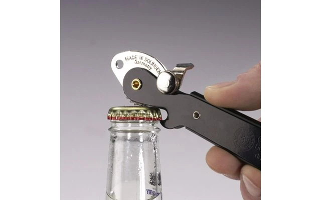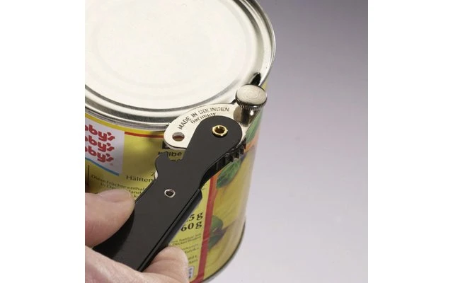 Pratico apriscatole a leva per aprire lattine rotonde e quadrate, incl. levacapsule per aprire bottiglie con tappi a corona.